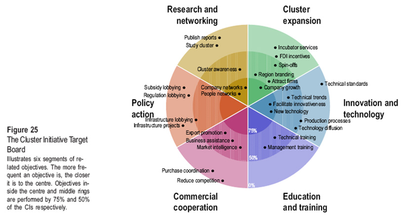 - Learning: Educational and training programs set up by the cluster to increase workforce know-how and develop specialist knowledge. These would very likely be organized through collaboration with consultants, specialist training firms and academic establishments.